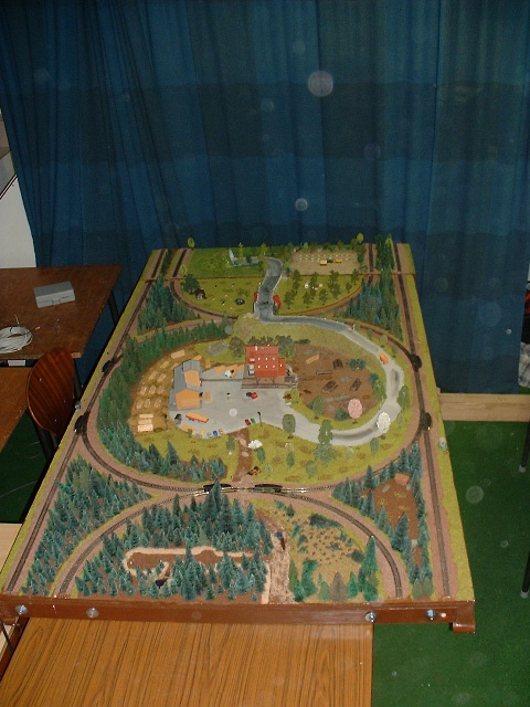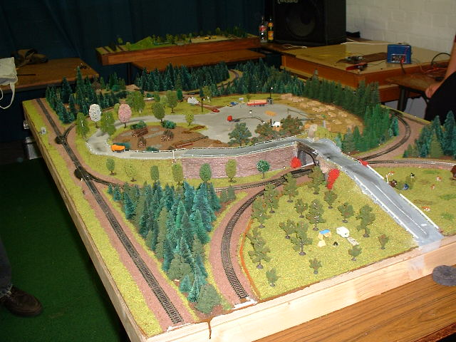 Den Erfolg des Streckenplanes stellten wir schon bald, nachdem wir die Gleise verlegt hatten, fest. Bei einer Ausstellung im Haus der Jugend hatte die Platte ihren ersten Einsatz, mit den Modulen der Kinder an zwei diagonal gegenüberliegenden Anschlüssen. Mit den Gleisen waren wir zufrieden, aber die Gestaltung der Platte war damals fast noch Rohbau.