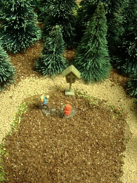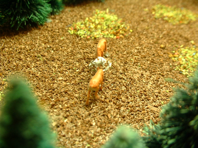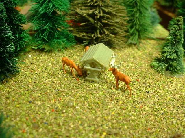 Wir haben der Platte etwas Leben verliehen, z.B. dadurch, daß das Gebäudemodell den motorischen Antrieb der Säge vorsieht, ein niedliches Detail. Auch der Wald ist belebt, mit Hochsitz, Hirschen, Wanderwegen, einem Holzrückezug und Anderem. Wir haben eine Kuhwiese angelegt und eine alte Obstplantage. Auf dieser haben sich wilde Camper ihren Lagerplatz eingerichtet.