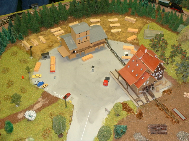 Mit der Frage wie man aus einer solch merkwürdigen Streckenführung vernünftige Modellbahnplatte macht, haben wir uns lange beschäftigt. Die Entscheidung fiel dann auf ein Sägewerk im Mittelkreis, außen umgeben von Wald, teilweise abgeholzt, teilweise wieder aufgeforstet. Zur einen Schmalseite der Platte sollte sich offene Landschaft anschließen.